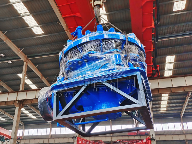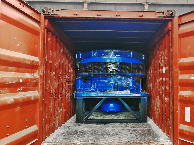 隨著印尼地區對當地基礎建設的大力發展,砂石料生產的需求也持續增強。繼上次發貨不到一個月的時間,鄭州中意礦機為客戶定制的PSG1320圓錐破碎機設備正式下線,在工人師傅的相互配合下,這臺3.2米高、2.9米長的彈簧圓錐破碎機順利裝箱,即將奔赴海外。