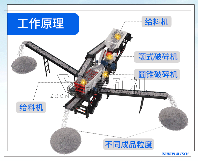 移動式鄂破圓錐一體機是將顎式破碎機、圓錐破碎機、振動篩、給料機四臺主機進行搭配組合,安裝在同一臺移動車架上,形成了使用方便價格便宜的移動破碎站。移動式鄂破圓錐一體機是按照粗碎、中碎、細碎成品需求自主組合,經濟使用,適用于中小產量,多元化全自動粗細二級破碎,滿足不同需求的客戶群體。