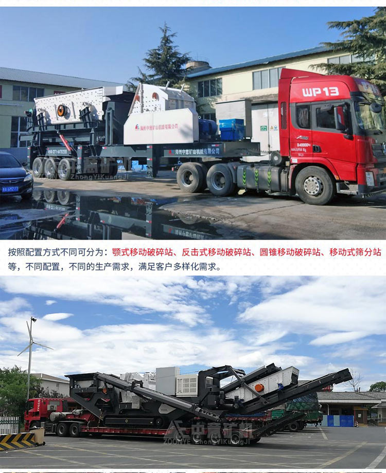鄭州中意移動破碎站的分類。一般來說,將破碎機或振動篩等安裝在可移動的車輛底盤上,分為輪胎和履帶式兩種,可根據現場和客戶的生產需求進行搭配,無需繁瑣的打樁過程,現場即可開機生產,多臺不同配置的移動破碎站設備可結合形成完整的生產線。同時,移動破碎站集成PLC控制系統,可實現一鍵啟動、停機等, 智能方便、節省成本。