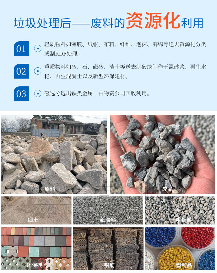 裝修垃圾處理設(shè)備,通過(guò)對(duì)裝修垃圾進(jìn)行破碎、尺寸篩分、比重篩分、磁選、風(fēng)選、人工分揀、除塵等工藝,分選出金屬、木頭、塑料、玻璃、有色金屬、再生骨料和RDF垃圾衍生燃料,實(shí)現(xiàn)資源回收,再生利用,解決了裝修垃圾污染環(huán)境的問(wèn)題。