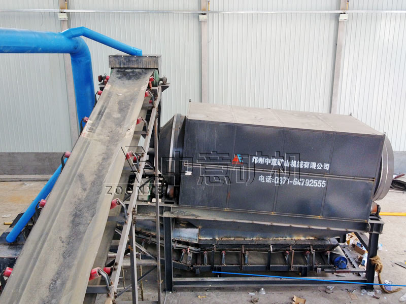 2、初級篩分:經破碎除鐵后的骨料被傳輸至滾筒篩設備處,加裝風機的滾筒篩可以干凈地將物料中的細小紙屑、塑料、木渣等分離出來,再生骨料能夠加工回收利用,輕質物能夠重塑加工。